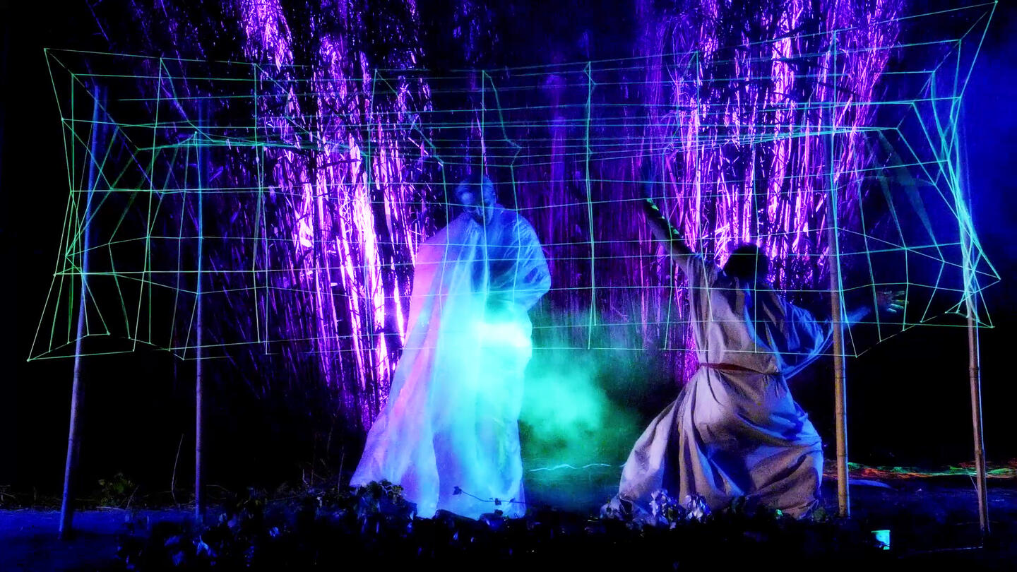 The essential yet impactful stage designs integrate harmoniously with the surrounding space, merging with the location through a play of natural and technological elements. Among my most striking installations are special fluorescent thread structures, resembling laser beams, capable of creating large-scale three-dimensional figures (up to 40 meters), inspired by sacred geometry and designed to interact with the movements of both performers and the audience.