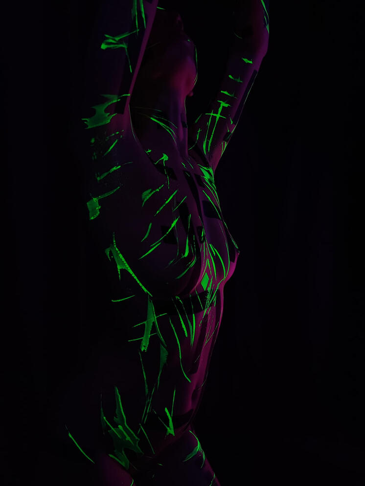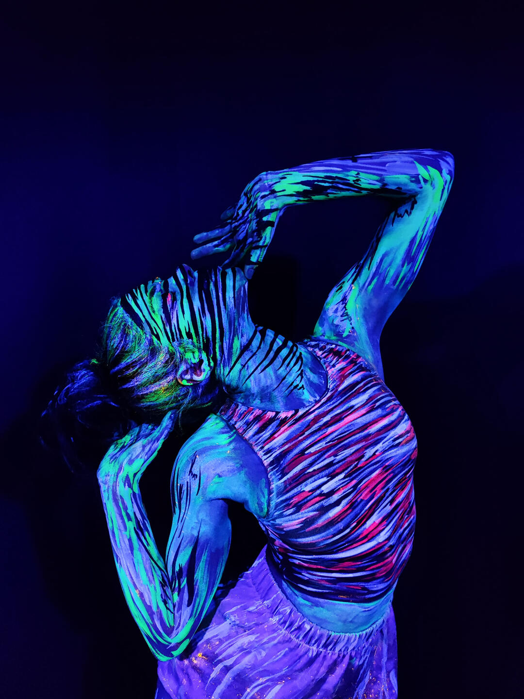 In 2015, I developed my own concept of Ritual Body Painting, an art form that intertwines transcendental painting and meditation, gradually evolving towards a greater focus on scenic movement, ultimately leading to the creation of a true “Dance of Light.”