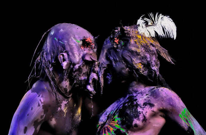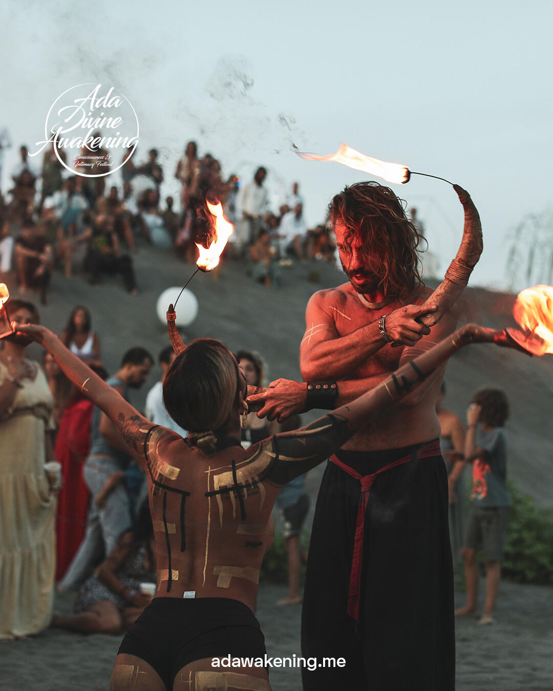 The show intertwines Ritual Body Art, dance, and avant-garde experimental theatre, creating a hypnotic fusion of movement and symbolism. Matter, fire, and colors come to life in sync with the music, weaving between ancestral dances and mythological beings.At its core, the performance reveals the encounter with the Ancestral Divine Creatures that lie dormant within us—primordial forces that awaken only in the presence of an overwhelming energy, such as love or passion.These creatures are both mesmerizing and fearsome, as wild and powerful as they are delicate and uncertain. They emerge as symbols and archetypal forms, embodying my personal vision of love.The performance unfolds through every stage of love: the euphoria of infatuation, the fire of passion, the fear of loss or betrayal, the disillusionment of separation, and finally, the depth of mature love—when all masks are stripped away, revealing the raw essence of connection.